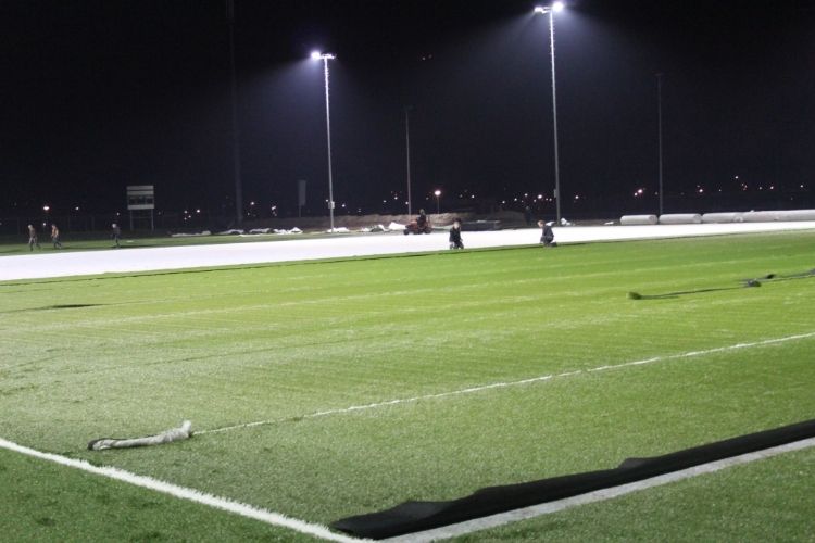 Ondanks het slechte weer is het bijna 12.000 m2 grote veld binnen twee dagen verlegd. Op de eerste dag heeft de verlegploeg van K.S.P. in samenwerking met Bas Lodewijkx Synthetic Grass Specialist de ProPlay verlegd. Op de tweede dag heeft J&E Sports B.V. direct het gras verlegd. Het was een enorme uitdaging om deze klus onder de slechte weersomstandigheden te klaren. Dankzij het vakmanschap van K.S.P., Lodewijxs en J&E Sports B.V. is de gehele installatie vlekkeloos verlopen.